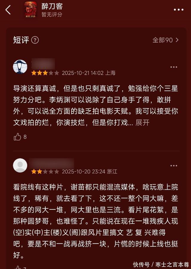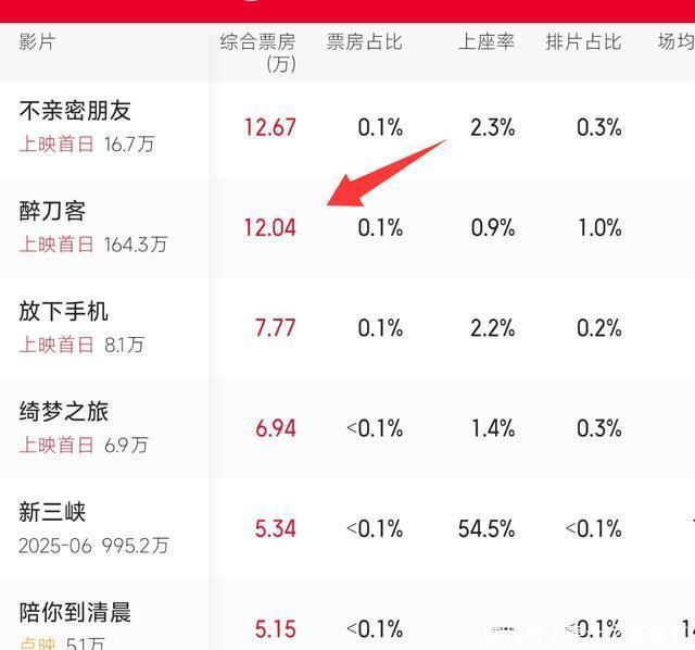 《醉刀客》的主演几乎都是一些影视圈的十八线小明星,再加上没有大制作公司撑腰,营销成本也不大。 于是,上映首日院线只给出了1%的排片率,而首日票房更是只有凄凄惨惨的12万。