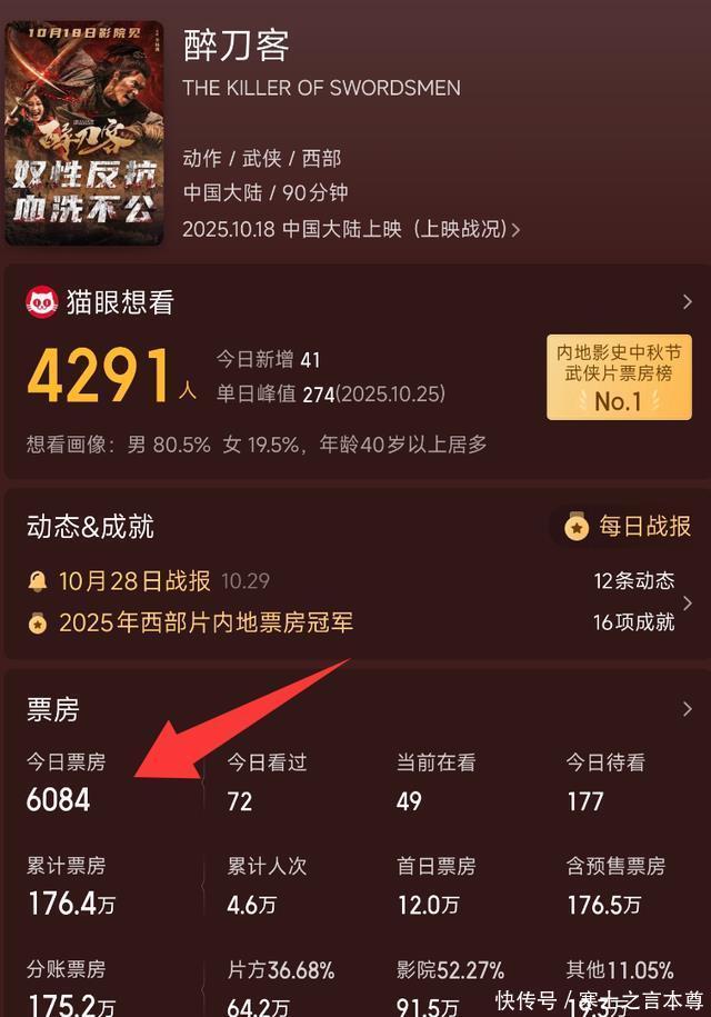 当然开局不利也不能证明就是结局,如果能像《八角笼中》那样凭借口碑实现票房逆跌,那也能接受。 可最终的结果,却是令人绝望的。 截止到发稿前,醉刀客上映14天,累计票房只有176万,甚至单日票房降落到只有几千块。 败局已定!