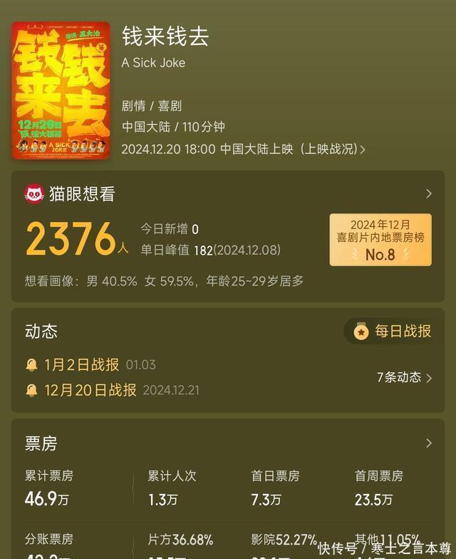 再反过头来看《醉刀客》,既没有卡司,也没有话题、IP,遂只能在质量上下手,可质量却只有网大水准。 扑街,也就是必然了。 而同样怀揣梦想却用真金白银认清现实的还有很多人。 比如王大治,演员同样是三线开外,去年他拍了一部电影《钱来钱去》也想改变现状,一鸣惊人。 结果惊人确实惊到了,票房只有46万。